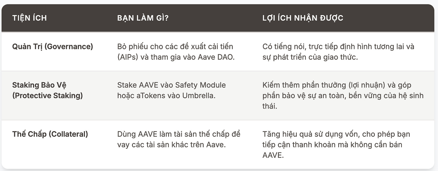 Dưới đây là bảng tóm tắt nhanh về các “quyền lời” mà bạn có được khi nắm giữ token AAVE.