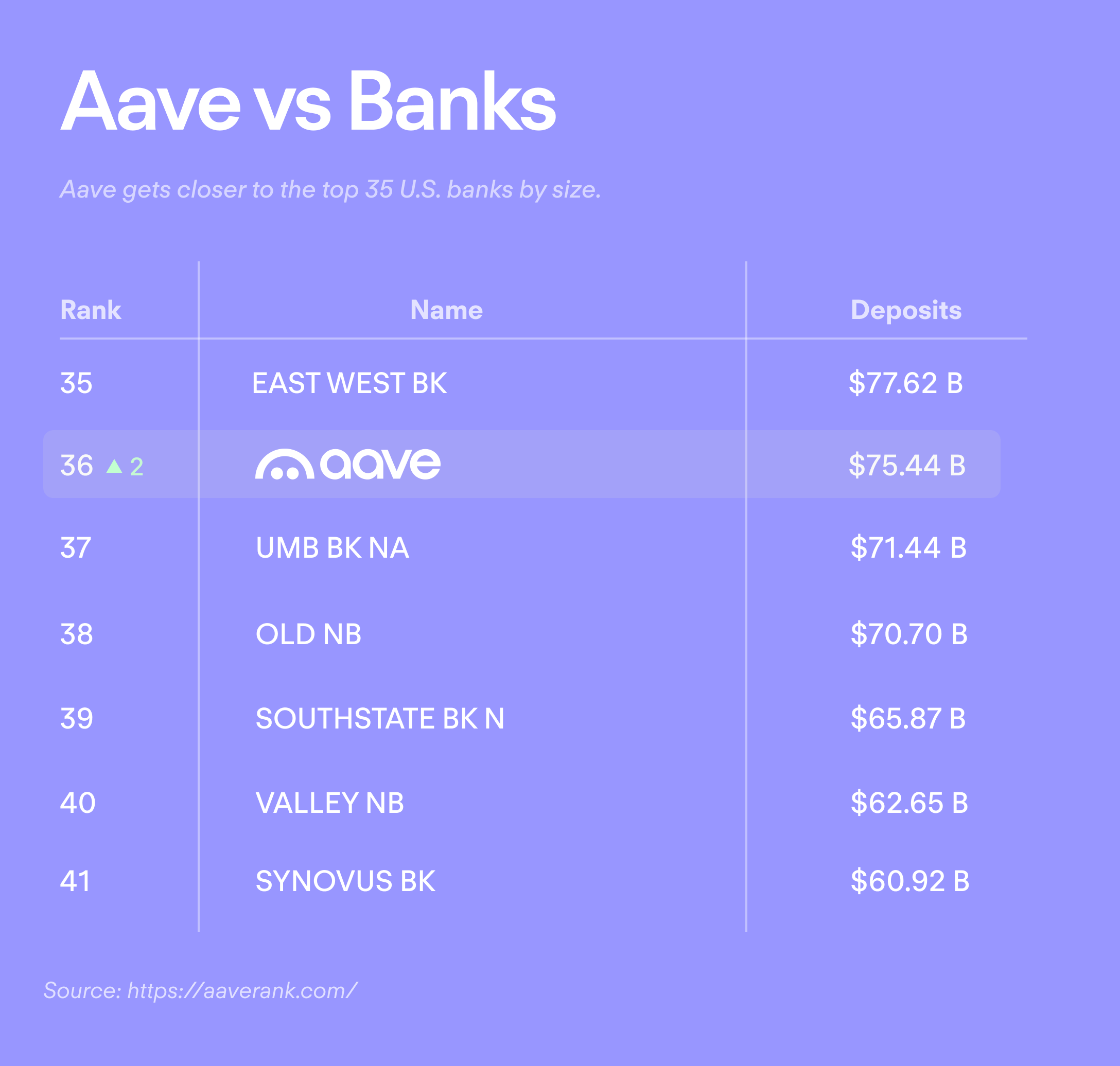 Bên dưới là bảng xếp hạng TVL của Aave xếp hạng 36 so với các ngân hàng lớn nhất tại Hoa Kỳ theo tiền gửi ( số liệu cập nhật tháng 10/2025)